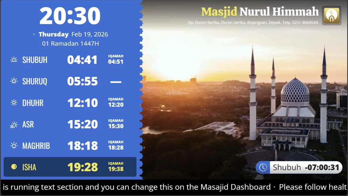 Show important announcement about Masjid with running text that shows nicely in animated format at the bottom part of Masajid Screen.