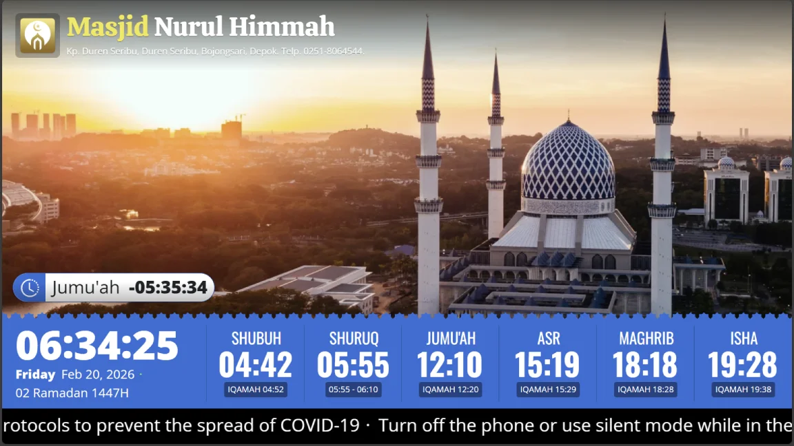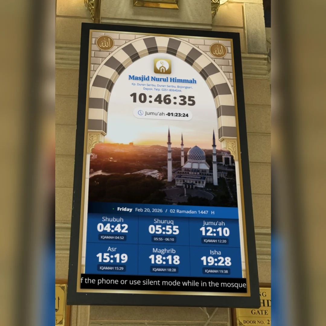 Display accurate prayer times, namaz schedule, athan reminders, iqamah countdown, and multimedia announcements on your mosque screen, seamlessly integrated with a free mosque website. Enter your masjid name below to get started!