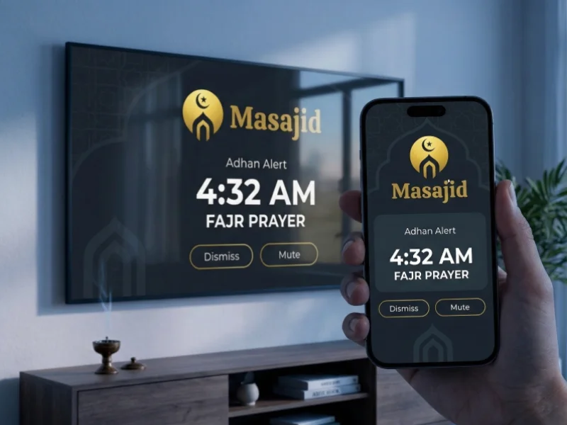 You can display prayer times on a TV by using a masjid prayer time display system like Masajid. Simply connect a device such as MasajidBox, Android TV, or a mini PC to your TV and run Masajid Screen to automatically show prayer schedules, athan reminders, iqamah countdown, and announcements.