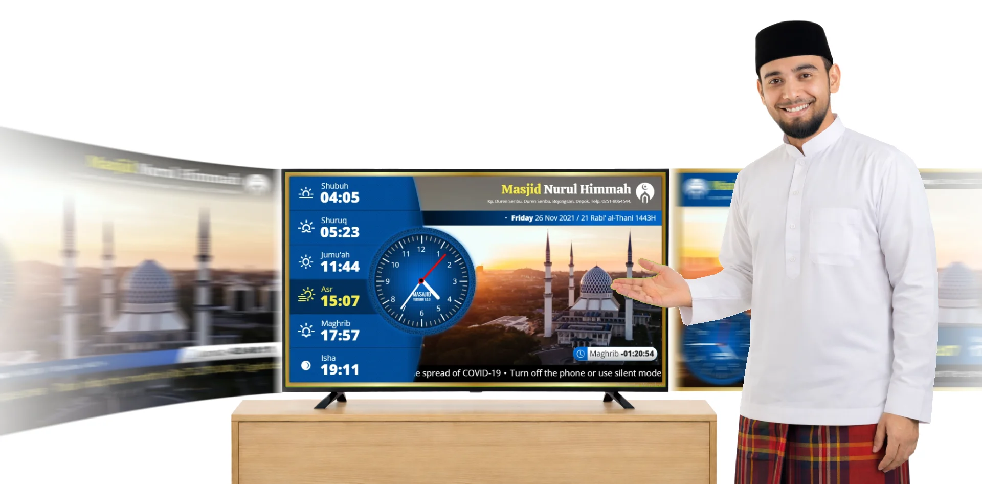 Sebelum ini banyak masjid menggunakan jam solat digital LED, namun kini semakin ramai yang beralih kepada paparan jam solat berasaskan TV seperti Masajid. Sistem moden ini boleh memaparkan jadual solat, pengumuman masjid, program Islam serta kiraan mundur iqamah dengan paparan yang lebih fleksibel dan informatif.